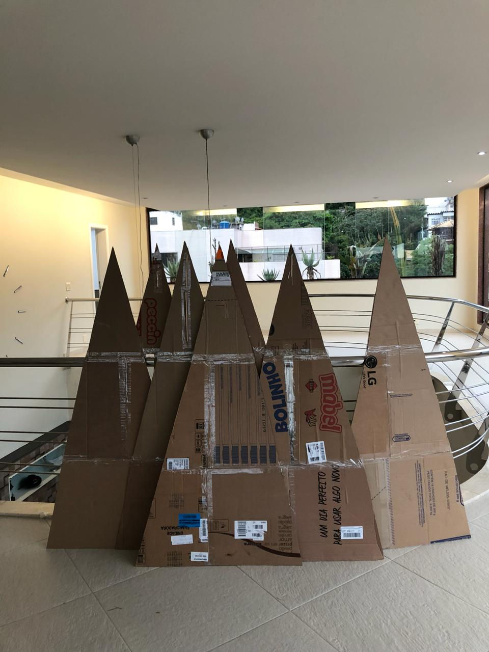Para faze-las não foi feito estilo ''quebra-cabeças''. Foram abertas as caixas de papelão unidas com cola de contato. Após isso, essa chapa foi cortada em formato de triangulo, com medidas definidas.